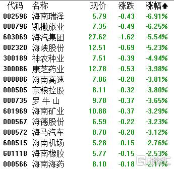 海南板块回调,海南瑞泽、凯撒旅业跌超6%,海汽集团、海峡股份、神农种业、康芝药业等跟跌。