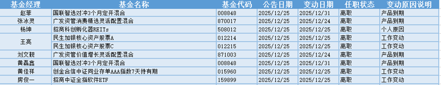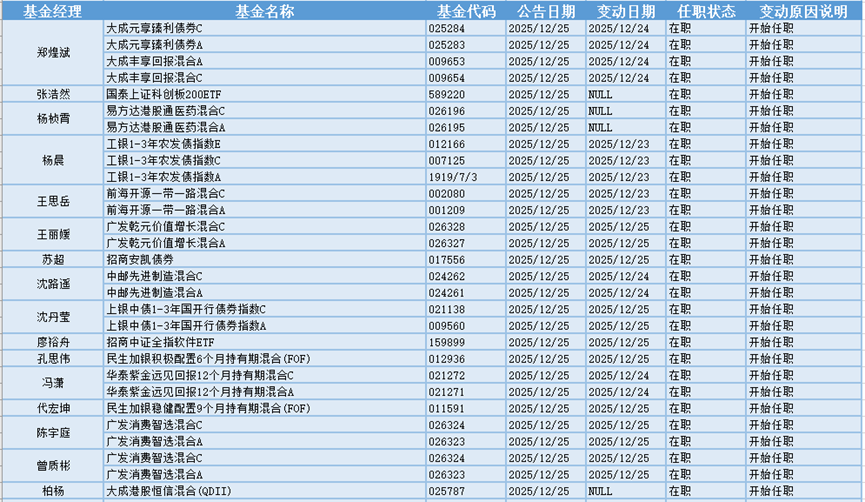 基金经理是一只基金产品最核心的成员,能决定一只基金的投资方向、投资策略以及投资风格,基金经理出色的择时选股能力和调研预测能力是基金业绩的有力保证,所以基金经理是投资者在选择基金产品时的重要依据。基金经理的变动很大程度上会影响到基金产品未来的表现,是一个需要特别关注的信息。12月25日共有24位基金经理发生任职变动。