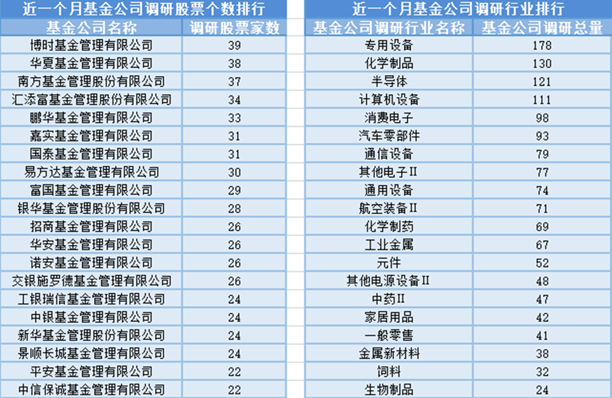 近一个月(11月25日-12月25日),博时基金参与公司调研的数量最多,共调研39家上市公司,此外调研较为活跃的还有华夏基金、南方基金和汇添富基金,分别调研38家、37家、34家上市公司;从调研行业上来看,基金公司对专用设备行业的上市公司调研次数最多,共有178次,其次是化学制品行业,基金公司调研了130次。
