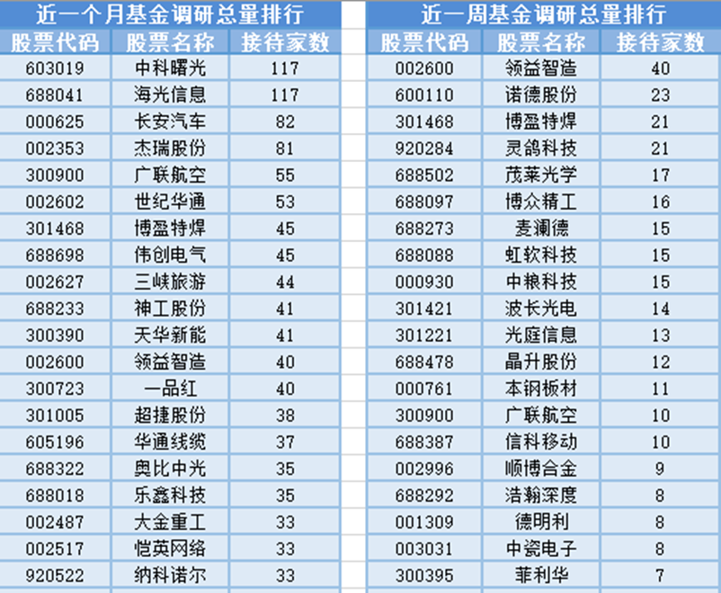 从个股调研情况上来看,最近1个月(11月25日-12月25日)最受公募基金关注的是中科曙光,中科曙光属于专用计算机设备行业,主营业务为高端计算机、存储、安全、数据中心产品的研发及制造,同时大力发展数字基础设施建设、智能计算等业务。共有117家基金管理公司参与调研,其次是海光信息和长安汽车,分别接受117家、82家基金管理公司的调研。