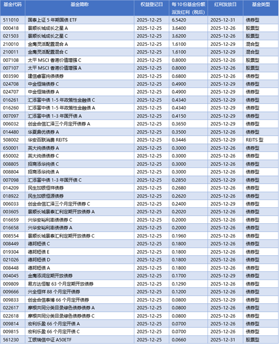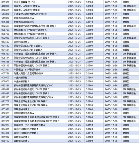 四、12月25日基金分红一览