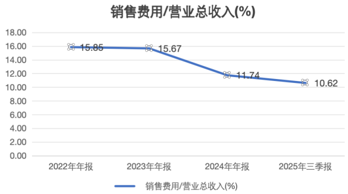 销售费用从2022年的386亿元降至2024年的336亿元,三年累计下降13%;2025年前三季度销售费用为248亿元,同比再降13.69%;销售费用率(销售费用/营收)从2022年的15.85%一路下滑至2025年Q3的10.62%。