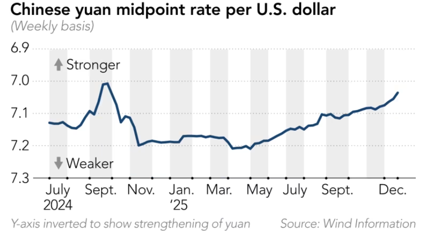 人民币今年早些时候曾走弱,此前特朗普总统在4月加征“对等”关税。但在他迅速放弃将对华关税提高至100%以上的计划后,人民币走势发生逆转。10月底,特朗普在韩国与习近平会晤,两国达成为期一年的贸易休战协议,进一步缓解了紧张局势。