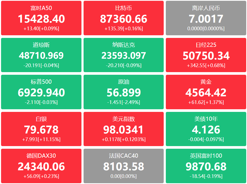 美股三大指数收盘均微跌,纳指跌0.09%,本周累涨1.22%;道指跌0.04%,本周累涨1.2%;标普500指数跌0.03%,本周累涨1.4%。纳斯达克中国金龙指数收涨0.72%,本周累计上涨0.64%。欧洲股市因圣诞节休市。