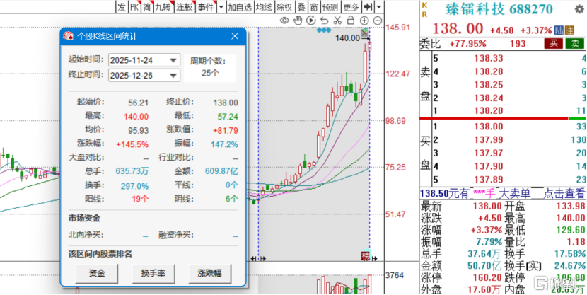 自11月24日以来,该股在近一个月内累计涨幅高达145.5%,截至公告前周五收盘报138元,总市值达295.4亿元。