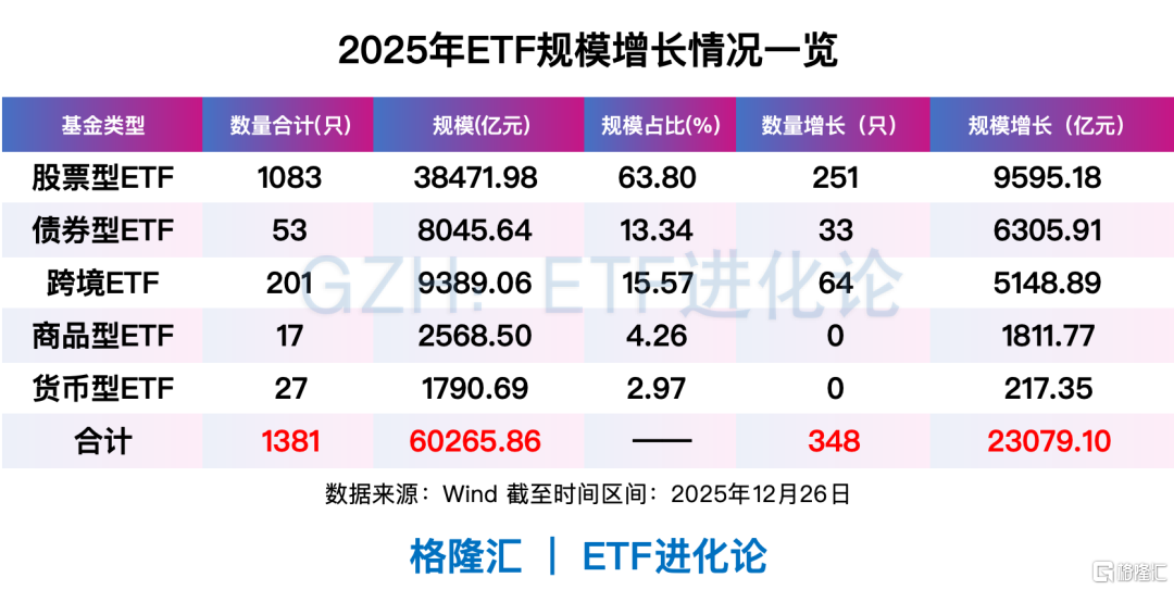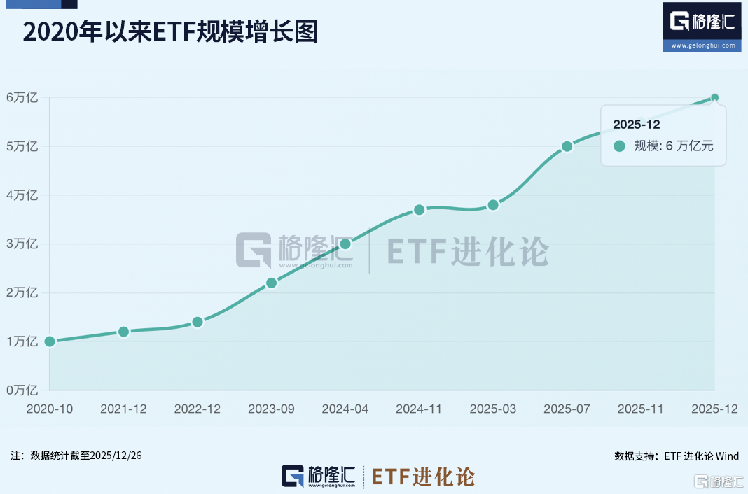 2025年12月26日,国内ETF规模历史首次突破6万亿元大关,达到6.03万亿元,较年初的3.73万亿元增长62.6%,年内净增2.29万亿元。