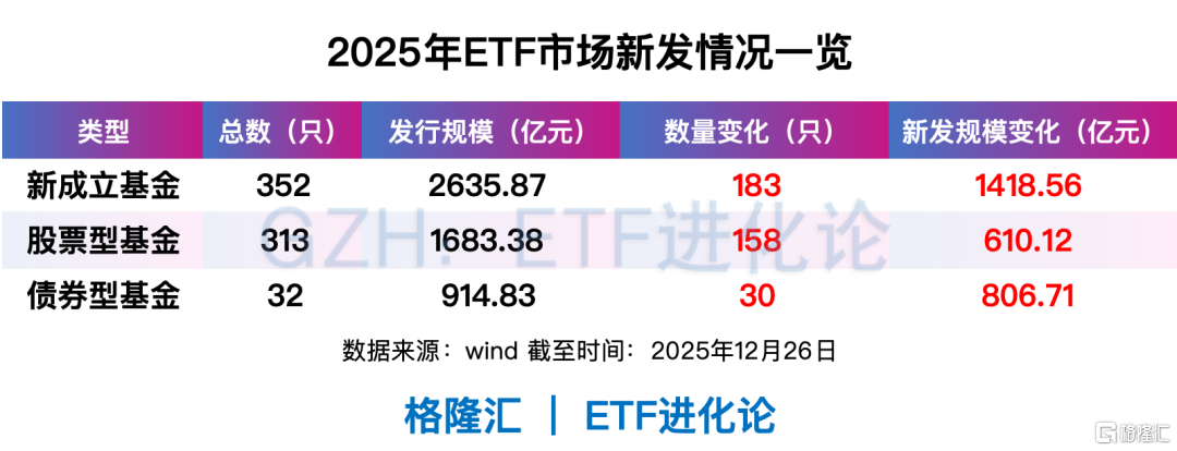 以成立日计算,截至12月26日,年内新成立了352只ETF,同比翻倍创下历年新高,合计募集规模2635.87亿元,同比继续翻倍增长。