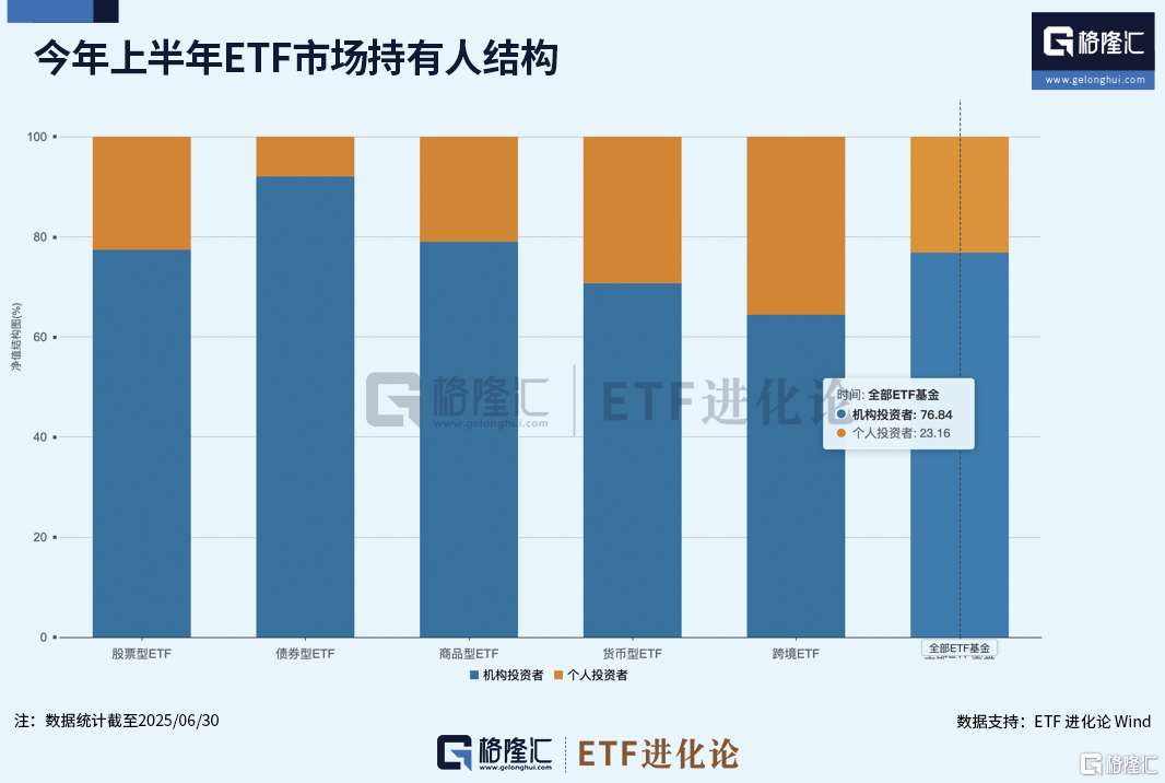截至今年上半年,ETF市场的机构投资者和个人投资的持有占比分别是:76.84%与23.16%。
