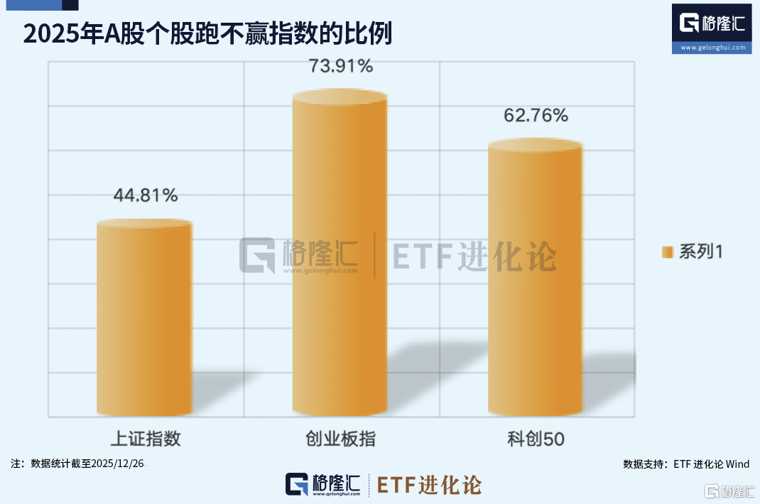 截至12月26日,创业板指、科创50指数、上证指数今年分别涨51.47%、36.09%、18.26%,近74%的个股跑不赢创业板指,超62%个股跑不赢科创50,超44%的个股跑不赢上证指数。(剔除2025年年上市的个股)