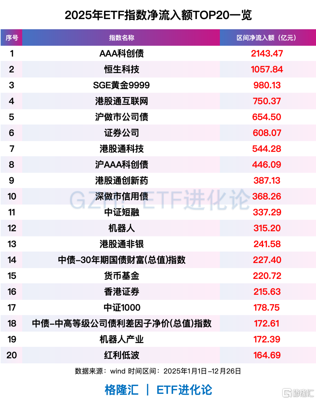 其中AAA科创债、恒生科技、SGE黄金9999、港股通互联网2025年分别净流入2143.47亿元、1057.84亿元、980.13亿元和750.37亿元。