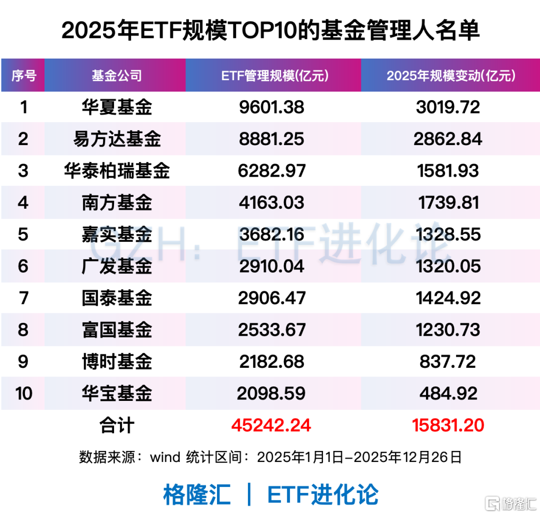 ETF行业步入“强者恒强”的成熟期,马太效应在2025年愈发凸显,规模前十管理人贡献69%的ETF规模增量。