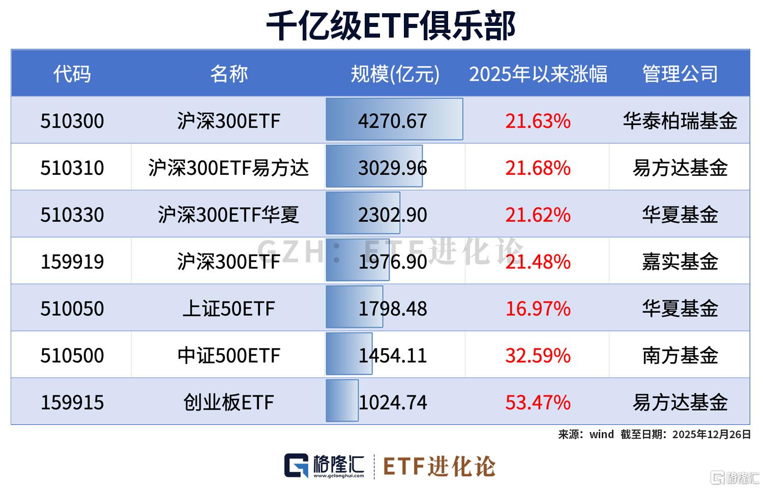 其中,华泰柏瑞沪深300ETF以4270.67亿元的体量一骑绝尘,成为全市场唯一突破4000亿的“单品之王”。紧随其后的易方达、华夏、嘉实旗下的沪深300ETF,华夏上证50ETF、南方中证500ETF、易方达创业板ETF,全部跻身“千亿俱乐部”。
