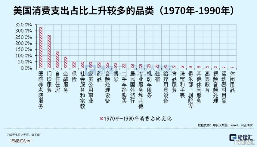 而在1959年至1980年间,美国家庭在医疗保健、金融保险、娱乐等细分支出占比提升幅度排名前三。