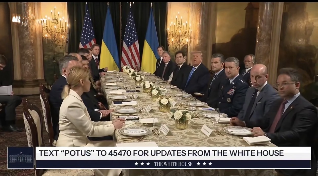 特朗普与泽连斯基在海湖庄园一间华丽的餐厅内举行双边会谈,双方代表团陪同出席。美方阵容包括国务卿卢比奥、国防部长赫格塞斯,以及维特科夫和库什纳。