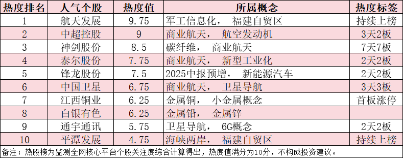 今日十大热股:航天发展、中超控股领衔,神剑股份7天7板,商业航天概念持续爆炒
