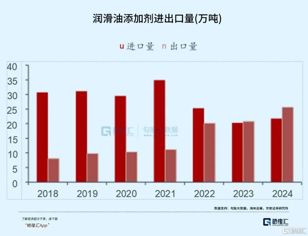 2023年我国润滑油添加剂进口量下降至20.3万吨,出口量增至20.8万吨,进口依赖度有所下降,我国开始成为净出口国,国产品牌正在加速替代。