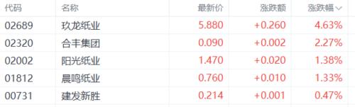 纸业股拉升,玖龙纸业涨超4%,合丰集团、阳光纸业、晨鸣纸业等跟涨。