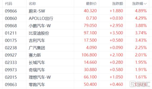 汽车股集体大涨,蔚来涨近5%,小鹏汽车、比亚迪股份、吉利汽车、广汽集团、赛力斯等跟涨。