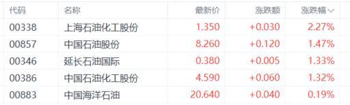 石油股活跃,上海石油化工股份涨超2%,中国石油股份、延长石油国际、中国石油化工股份、中国海洋石油等跟涨。