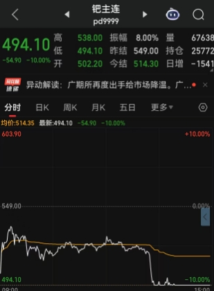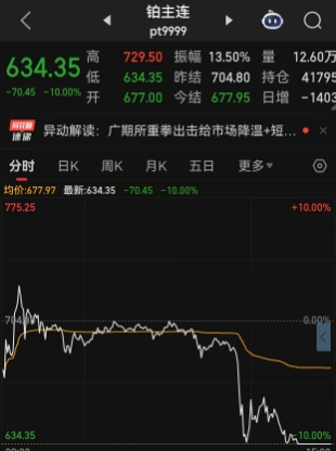 此外,一直暴涨的铂金、钯金也突然熄火,在沪银跳水的同时,铂金、钯金直线下挫,先后被空头摁在跌停板上,截至收盘铂金下跌10%,报634.35元/千克,钯金下跌10%,报494.1元/千克。