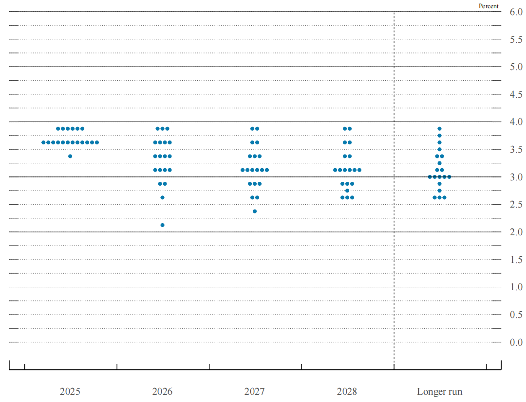 图:联邦基金利率目标区间中点或目标水平(点阵图)