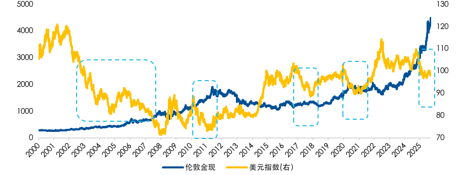 与此同时,政府对美联储政策的干预力度加大,加上美联储主席换届临近,市场普遍担忧其政策独立性下降。财政失衡与货币层面的不确定性相互叠加,导致投资者对美元体系及美元资产的信心下滑,推动美元进入贬值通道。作为美元体系的重要替代选项,黄金的货币属性价值充分释放,吸引全球资金增配。历史上每一轮弱美元时期,黄金均迎来了不错涨幅。