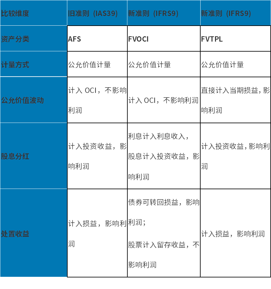 在旧准则IAS39下,保险公司买股票通常归类为“可供出售金融资产”(AFS)。这一分类非常灵活:平时股价的涨跌只计入资产负债表,不影响当期利润;一旦卖出股票,赚的差价就可以立马确认为当期投资收益,美化利润表 。但在新准则IFRS9下,这个“两全其美”的分类消失了。股票资产主要面临两种选择:要么归入FVTPL(以公允价值计量且其变动计入当期损益),要么归入FVOCI(以公允价值计量且其变动计入其他综合收益)。如果选择FVTPL,股价的每一次波动都会直接穿透到利润表。试想一下,如果碰上牛市当然皆大欢喜,但一旦遇到熊市或震荡市,市值的缩水会直接拖累净利润,导致业绩出现剧烈的周期性波动,这是追求稳健的保险企业无法接受的 。