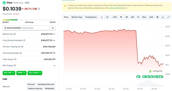 2025年12月27日,因安全漏洞问题,FLOW急速下跌,跌幅超40%。截至发稿,FLOW价格依旧不甚乐观,报0.1039美元,7天跌幅39.7%。