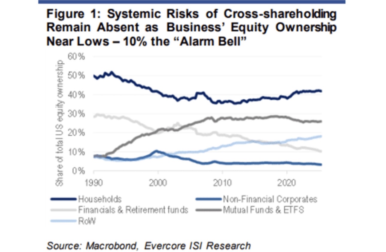他强调,虽然大型科技公司正不断加大对人工智能公司的投资,但交叉持股规模仍然相对较低。不过,如果企业持有全部股票的10%,类似千禧年前后的高点,就会凸显出重大的警示信号。