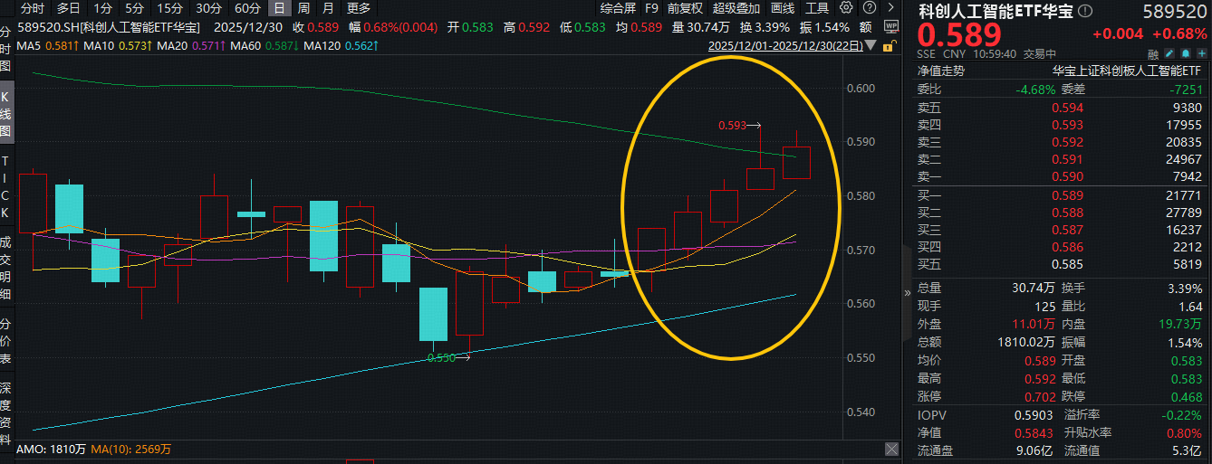 今日(12月30日)AI方向表现活跃,重点布局国产AI产业链的科创人工智能ETF华宝(589520)场内涨幅一度上探1.2%,现涨0.68%,盘中收复60日均线,冲击日线5连阳!
