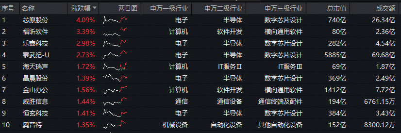 成份股方面,芯原股份领涨超4%,福昕软件涨逾3%,乐鑫科技、寒武纪涨超2%,海天瑞声、晶晨股份、金山办公、恒玄科技等个股跟涨。