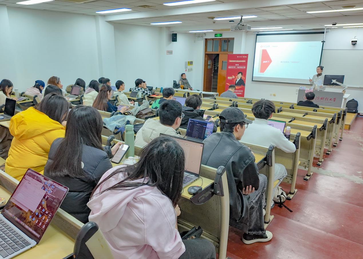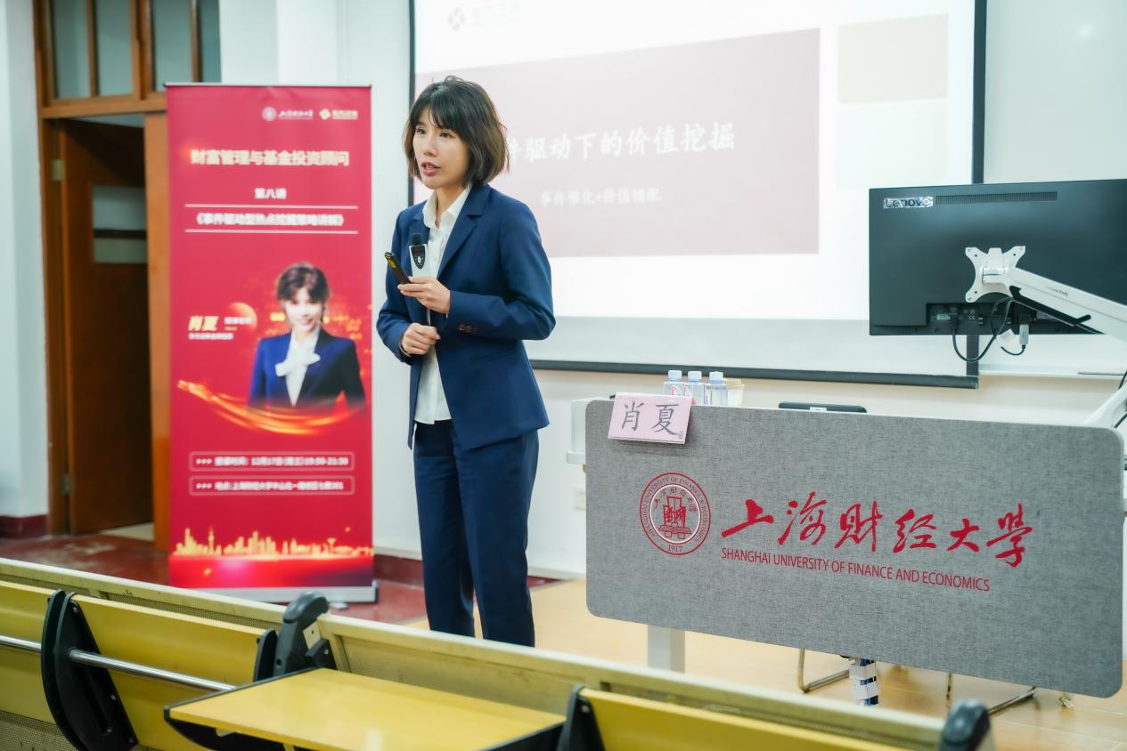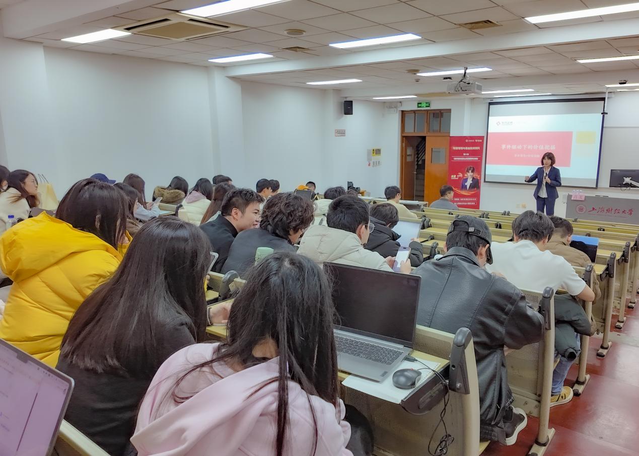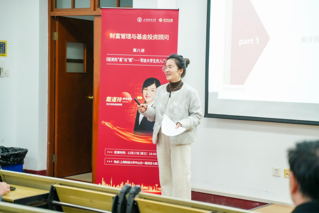 2025年12月17日晚,东方证券与上海财经大学联合举办的《财富管理与基金投资顾问》第八讲——本系列最后一讲课程在中山北一路校区七教301教室完美收官。本次课程由东方证券金牌投顾、东方证券南京北京东路营业部营销副总戴道玲老师主讲《投资的“易”与“难”——写给大学生的入门课》,以及东方证券金牌投顾、CWM国际财富管理师肖夏老师主讲《事件驱动型热点挖掘策略讲解》。两位主讲嘉宾从投资入门的认知突破与心态修炼,到事件驱动的热点逻辑与实战技巧,为来自上海财经大学、复旦大学、华东政法大学等多所高校的学子,献上了一场兼具实战价值与行业洞察的财富管理思想盛宴。