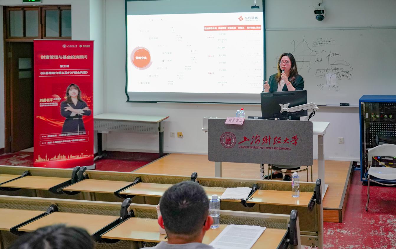 11月5日,上海财经大学与东方证券联合开设的《财富管理与基金投资顾问》系列课程第五讲在中山北一路校区七教301教室如期举行。本次课程由东方证券财富管理委员会金融产品总部总经理王峰先生带来《基金选品与组合构建》,以及金融产品总部总经理助理刘晨书洋女士主讲《私募策略介绍以及FOF组合构建》。两场主题分享紧扣实务,内容层层递进,为现场来自上海财经大学、复旦大学、华东师范大学等多所高校的学生带来了一场系统而深入的基金投资实战课。