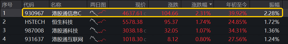 以半导体芯片产业链为代表的港股硬科技强势反攻,港股通信息C指数强势涨超2%,大幅跑赢恒生科技、港股通科技、港股通互联网等港股科技类指数。今年以来累计涨幅超39%,同样大幅领跑。