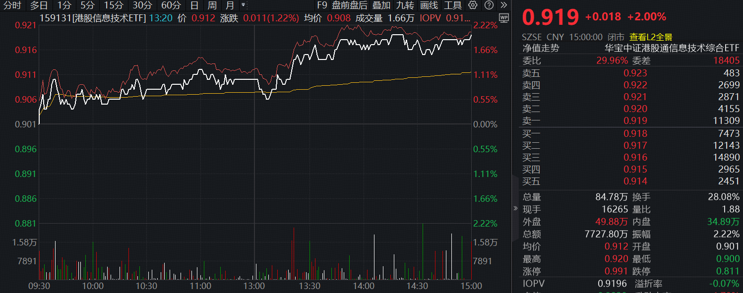 一、中芯国际大涨超4%,这只指数强势跑赢!首只重仓“港股芯片链”的港股信息技术ETF(159131)放量大涨2%