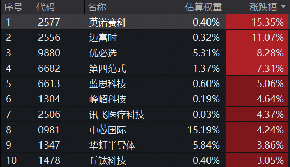 成份股方面,英诺赛科涨超15%,迈富时涨超11%,优必选涨超8%,第四范式涨超7%,中芯国际、讯飞医疗科技、峰岹科技、涨超4%。