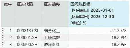 注:统计区间为2025年1月1日至2025年12月30日,细分化工指数近5个完整年度的涨跌幅为:2020年,51.68%;2021年,15.72%;2022年,-26.87%;2023年,-23.17%;2024年,-3.83%。指数成份股构成根据该指数编制规则适时调整,其回测历史业绩不预示指数未来表现。