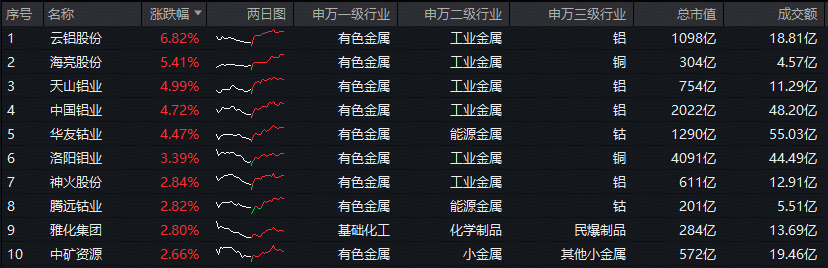成份股方面,云铝股份、天山铝业携手创历史新高,海亮股份涨超5%,中国铝业、华友钴业涨逾4%,洛阳钼业、紫金矿业等个股跟涨。