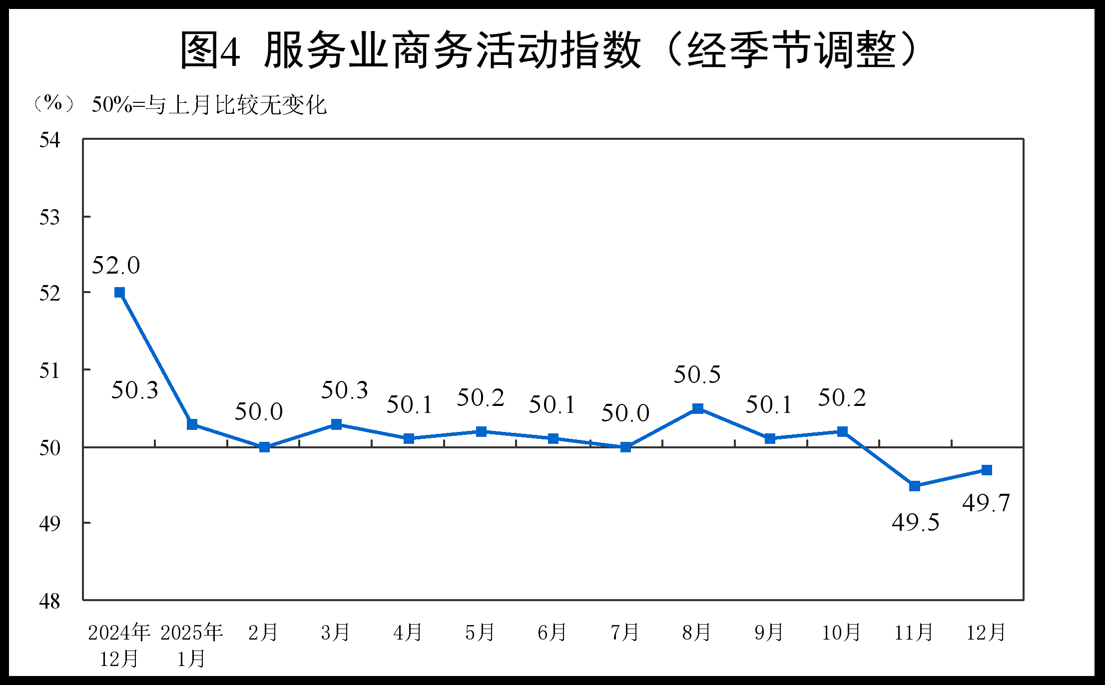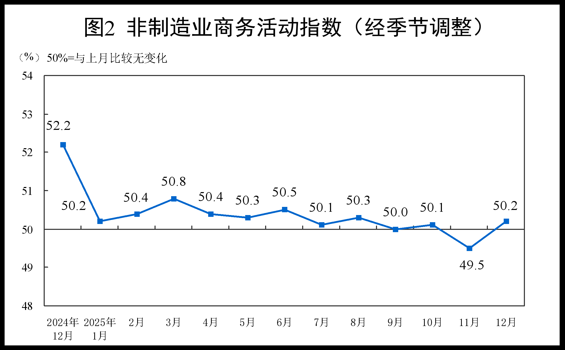 12月份,非制造业商务活动指数为50.2%,比上月上升0.7个百分点,重返扩张区间。