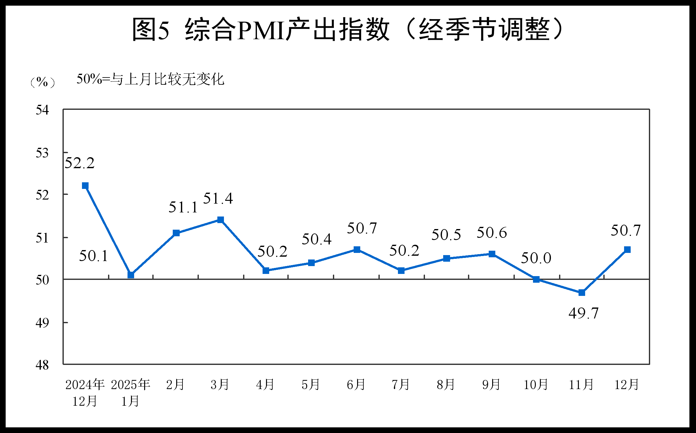 12月份,综合PMI产出指数为50.7%,比上月上升1.0个百分点,表明我国企业生产经营活动总体较上月扩张。