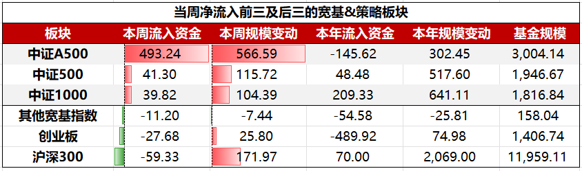 具体到细分板块,宽基&策略板块ETF中,净流入前三大板块依次为:中证A500、策中证500、中证1000;净流出前三大板块依次为:沪深300、创业板、其他宽基指数。
