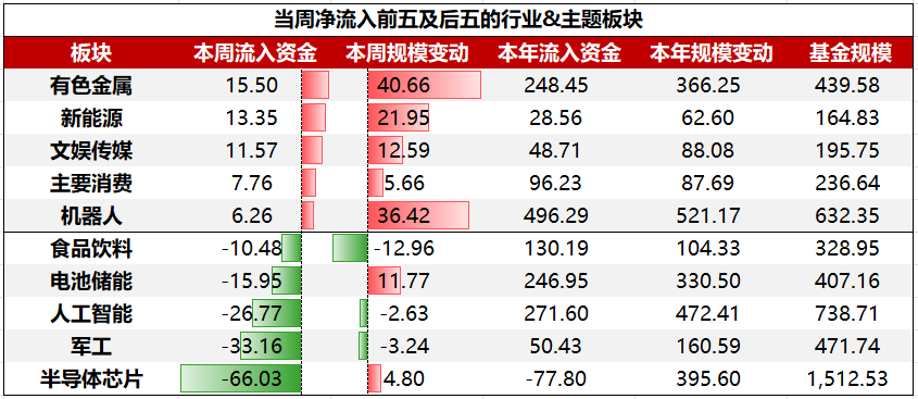 行业&主题板块ETF中,净流入前五大板块依次为:有色金属、新能源、文娱传媒、主要消费、机器人;净流出前五大板块依次为:半导体芯片、军工、人工智能、电池储能、食品饮料。