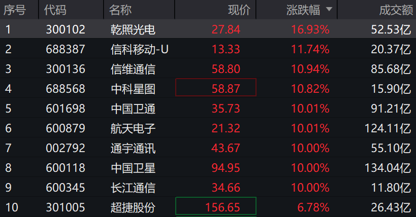 大主线领涨!卫星ETF(159206)涨超5%,成分股中国卫通、中国卫星、长江通信纷纷涨停!