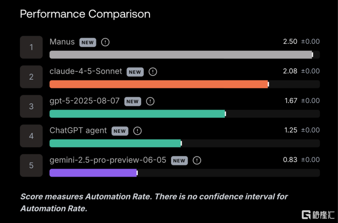 技术碾压:在全球最权威的AI评测之一,由ScaleAI发布的“远程劳动力指数(RLI)”上,Manus的自动化率以2.5%的惊人分数,强势登顶SOTA(State-of-the-art,即“现有最高水平”),将GPT-5、Gemini 2.5等一众巨头大模型甩在身后。