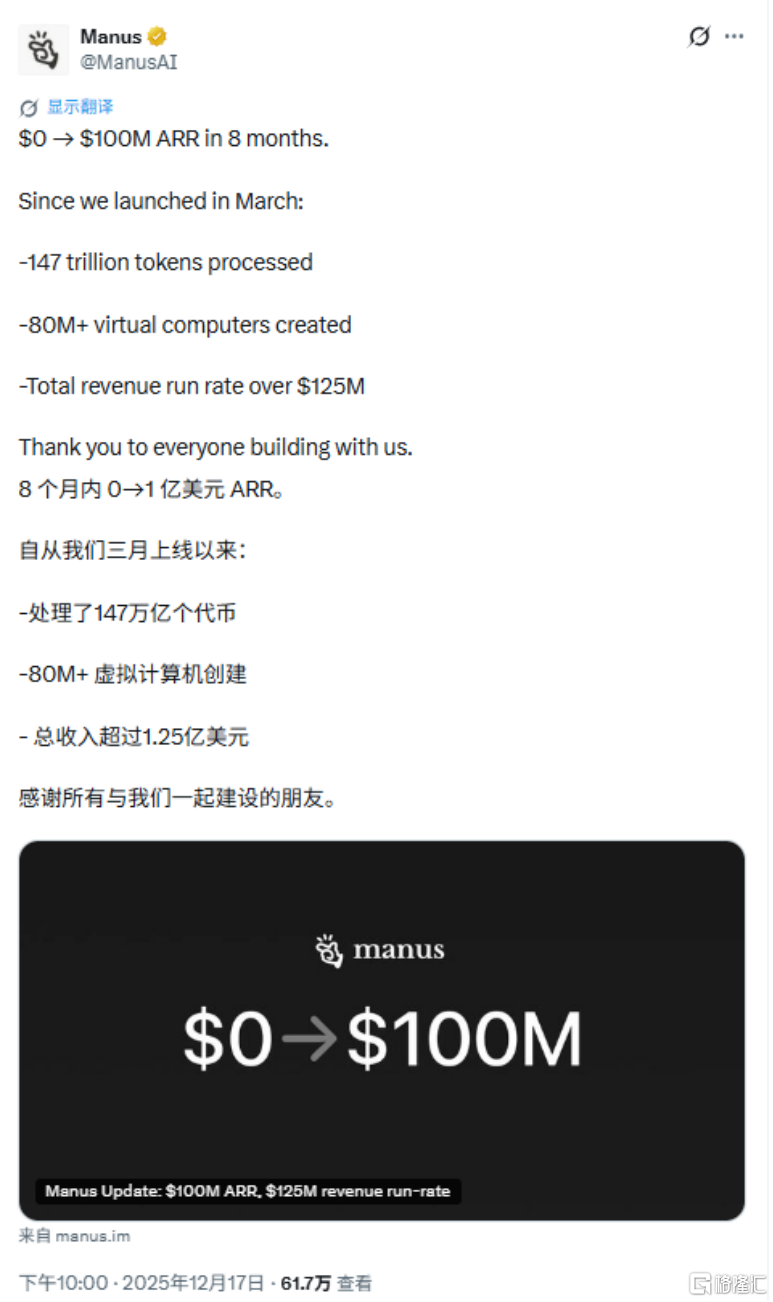 2025年12月中旬,Manus向世界交出了震撼的成绩单:ARR突破1亿美元,处理超147万亿个token,创建超8000万台虚拟计算机。