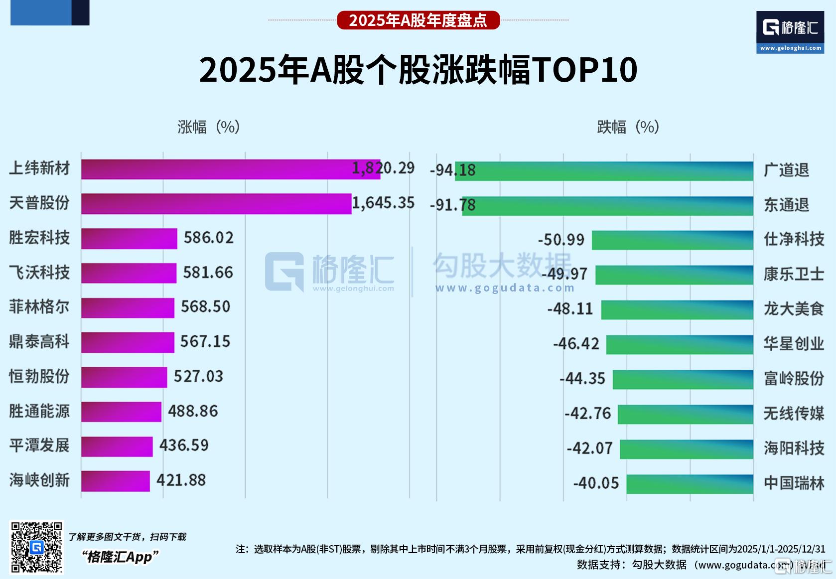 其中,上纬新材和天普股份分别以1820.29%、1645.35%的涨幅强势霸榜,广道退、东通退则以累跌94.18%、91.78%居跌幅榜前列。
