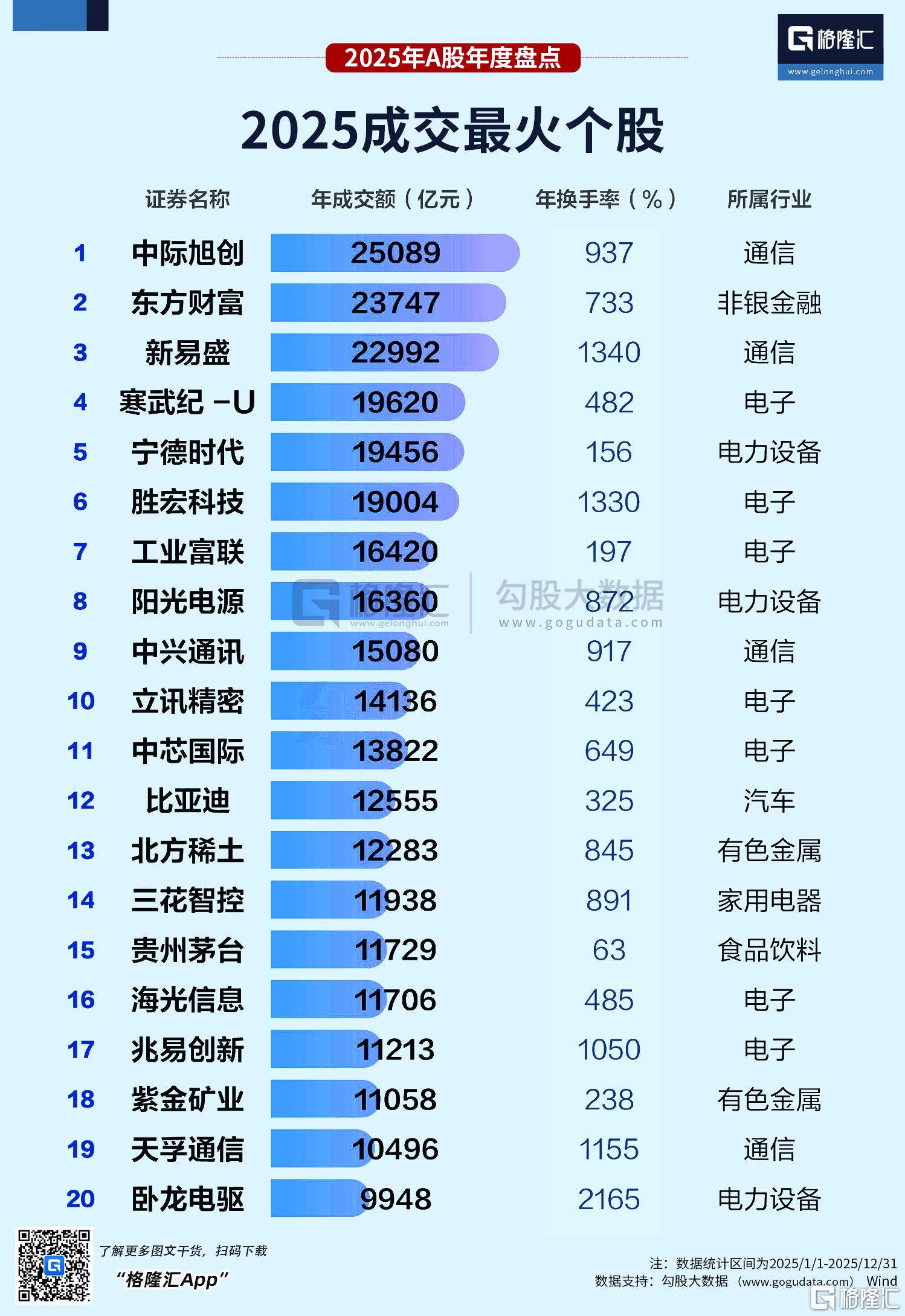 全年成交最火的个股中,中际旭创年成交额25089亿元、东方财富年成交额23747亿元、新易盛年成交额22992亿元位居前三。
