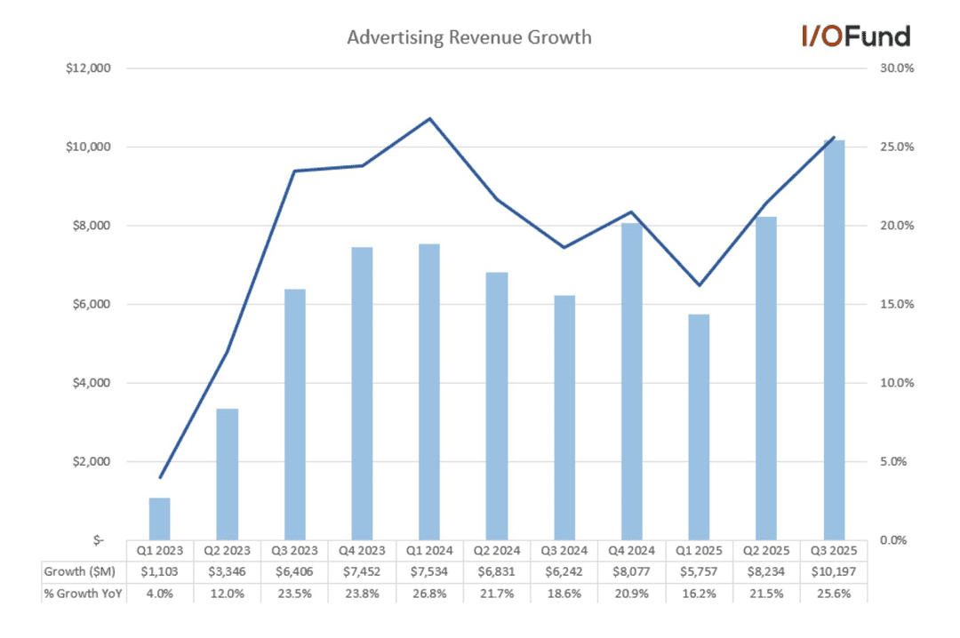 第三季度,Meta的广告收入同比增长25.6%——是六个季度以来的最快增速。第二季度和第三季度分别录得16.2%和21.5%的增长,是其有史以来最强劲的两次收入加速表现。这种势头可能会延续到第四季度,甚至在2026年全年保持20%以上的增长。