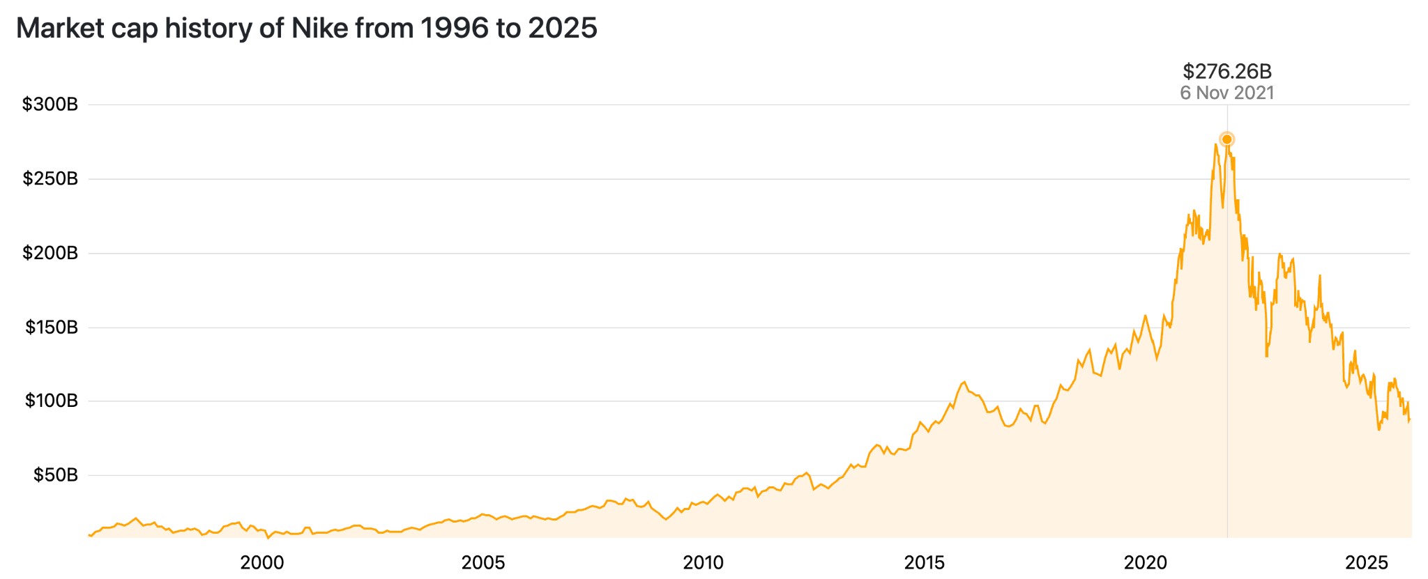 NIKE股价自2021年下半年触及历史高点以来持续下行,至2025年12月底已累计跌幅超过65%,市值从峰值约2810亿美元缩水至约900亿美元。