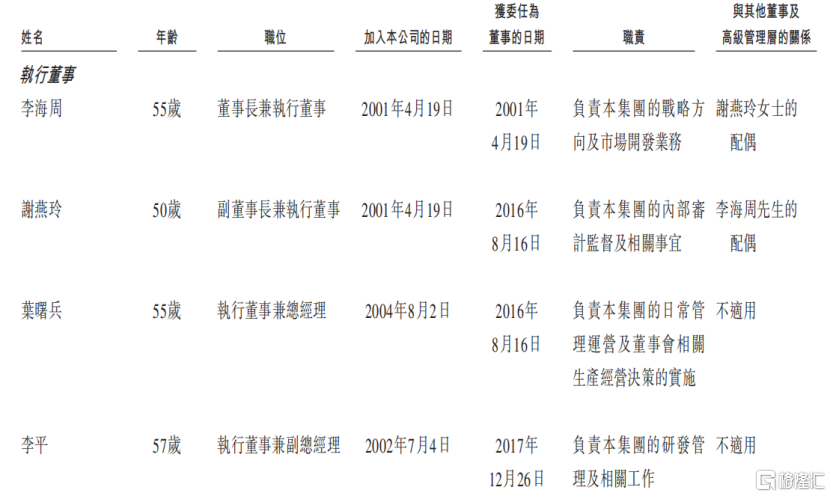 李海周今年55岁,目前担任董事长兼执行董事,除在兆威机电任职之外,他还在多家附属企业任职。李海周目前正在攻读长江商学院的工商管理硕士学位。